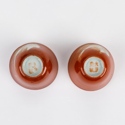 A pair of coral red pine and crane longevity tea cups from the Republic of China