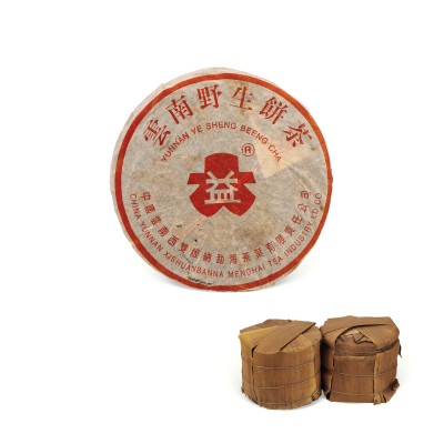 Two Stacks of Yunnan Wild Tea Cake with Red Ribbon, 1998