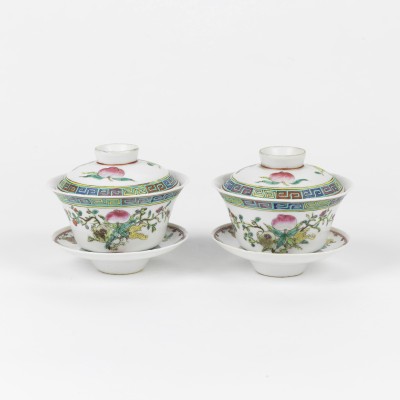 A Pair of Famille Rose Sanduo Lidded Bowls (Republic Period)