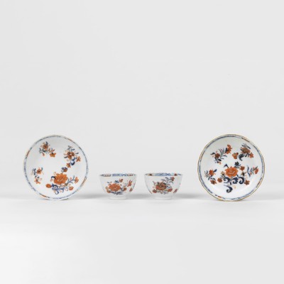 A pair of blue and white cups and saucers with gold and red floral patterns, 18th century (Kangxi and Yongzheng periods)