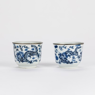 Late Qing Dynasty A pair of blue and white dragon-patterned cups